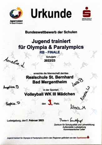 Am 07.02.2023 fand in Weikersheim im Wettkampf „Jugend trainiert für Olympia“ das Finale des Regierungsbezirks Stuttgart im Volleyball statt. Die Mädchenmannschaft der Altersklasse WK3 der Realschule St. Bernhard hatte sich hierfür qualifiziert. Sechs Mannschaften, eingeteilt in zwei Gruppen, spielten um den Einzug ins Halbfinale. Im ersten Spiel traf man auf das Gymnasium aus Backnang. Die Mädchen aus St. Bernhard starteten gut ins Spiel und konnten den Gegner durch starke Aufschläge unter Druck setzen. Das Spiel ging in zwei Sätzen sicher an die Realschule. Im zweiten Spiel musste man gegen das Gymnasium Weikersheim antreten. Bis zum Spielstand 8:8 konnten die Mädchen überraschend mithalten, aber dann kamen die körperlich deutlich überlegenen Spielerinnen aus Weikersheim in Fahrt, und das Spiel wurde eindeutig für Weikersheim entschieden. Damit war das Halbfinale erreicht, aber auch hier konnte man gegen die großen Spielerinnen aus Holzgerlingen, die im vergangenen Jahr das Bundesfinale in Berlin erreicht hatten, nichts ausrichten. Die Mädchen aus der Realschule St. Bernhard verkrafteten die Niederlage gut und starteten motiviert in das kleine Finale um Platz 3 gegen das Gymnasium Filderstadt. Hier gelang den Mädchen alles. Sie zeigten sichere und druckvolle Aufschläge und konnten durch einen guten Spielaufbau den Ball gezielt in das Feld des Gegners schlagen. Der erste Satz wurde deutlich mit 25:9 Punkten gewonnen. Durch viele Spielerwechsel gestaltete sich der zweite Satz spannender. Nach dem Spielstand 20:20 konnten die Taubertälerinnen endlich eine Führung erzielen und somit den Satz für sich entscheiden. Damit erreichte die Realschule St. Bernhard den großartigen dritten Platz im Regierungsbezirk Stuttgart, was die Spielerinnen und betreuende Lehrkraft Angelika Hübner freut. Besonderer Dank gilt auch dem Kollegium, das die Schülerinnen entgegenkommend für die Teilnahme am Wettbewerb freigestellt hat.