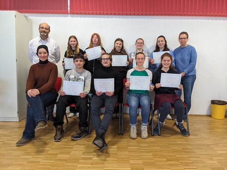 Am Dienstag, den 19.12.2023 wurden nun die DELF-Zertifikate an die stolzen Schülerinnen und Schüler ausgehändigt. Das DELF - „Diplôme d’études de la langue française“ - ist ein international anerkanntes Zertifikat, das den Schülerinnen und Schülern das Niveau A1 bzw A2 gemäß dem europäischen Referenzrahmen bescheinigt.